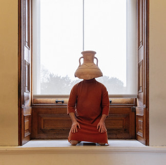 Why do we use metaphors of our body such as ‘legs’ and ‘ears’ to describe parts of a clay pot? Why do we indulge in language games that conflate the amphora with a human head, as the word ‘kuza’ in the Cypriot dialect denotes? PASHIAS very literally asks this question by replacing his own head with a fragment of a ceramic pot recently crafted in Cyprus and transported to the Fitzwilliam Museum. PASHIAS’ figure, part-human and part-clay, engages in a dialogue with ceramics exhibited in the museum, which were fashioned from Cyprus’ earth millennia ago.